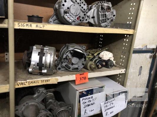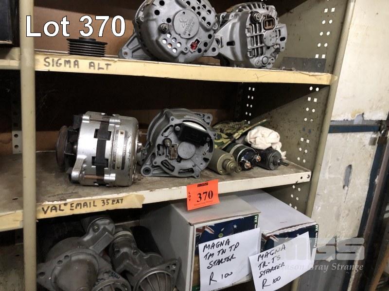 CONTENTS OF 3 x SHELVES, ALTERNATORS & STARTER MOTORS & SPARES, CHRYSLER, MITSUBISHI, VALIANT, MAGNA ETC.