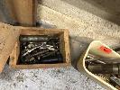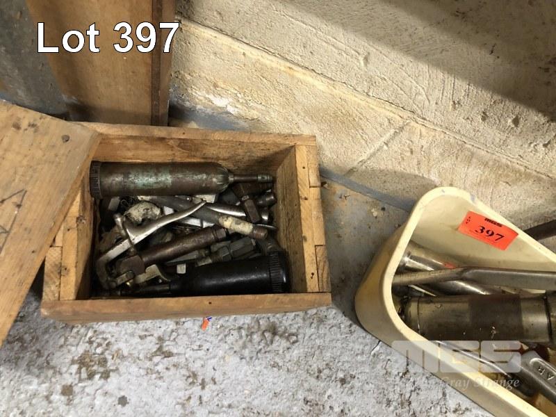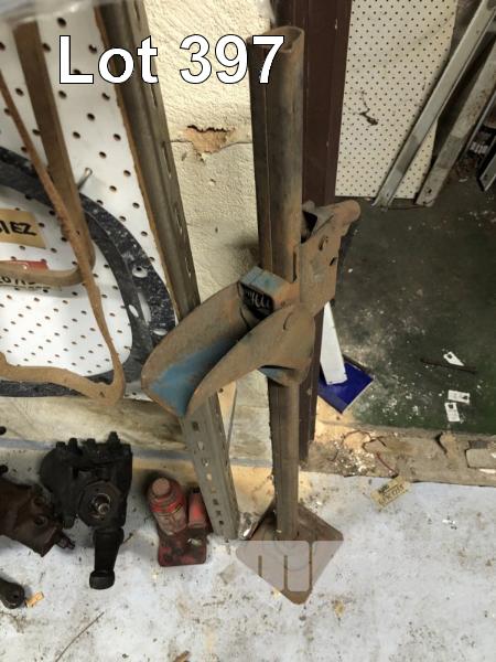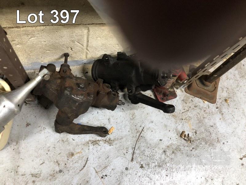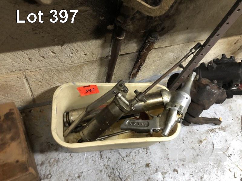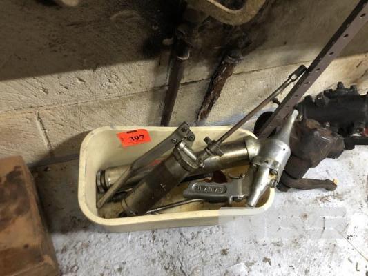OLD SCHOOL GREASE GUNS & ATTACHMENTS & 2 x SHAGINAW STEERING BOXES, 1 TO SUIT LEFT HAND DRIVE, 1 SUIT RIGHT HAND DRIVE, HYDRAULIC JACK, WORK MASTER, 1850kg, 1 x BUMPER JACK ETC.