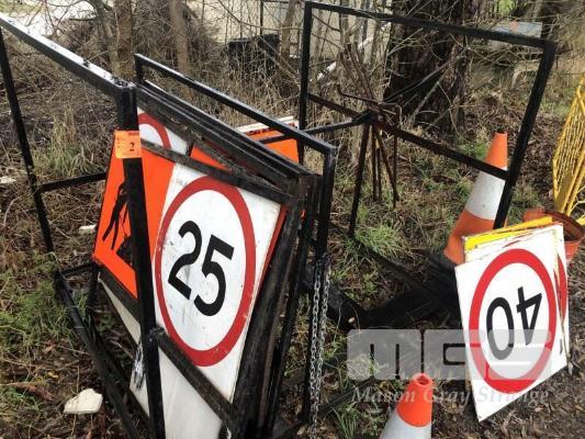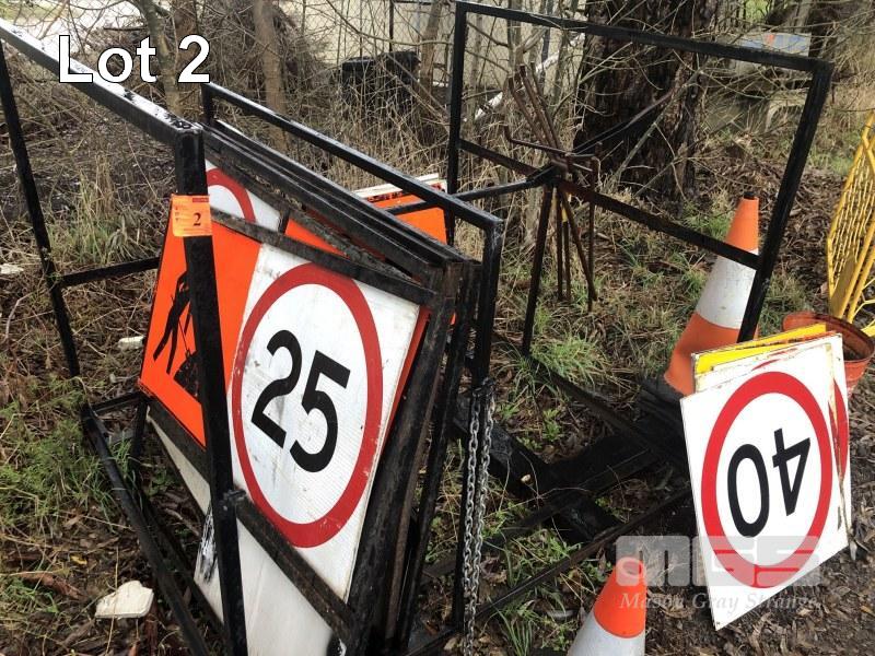 SIGN CARRIAGE WITH FORKLIFT POCKETS, 1800 x 1350mm, WITH 5 x ROAD SIGNS, STANDS & SAFTEY CONES