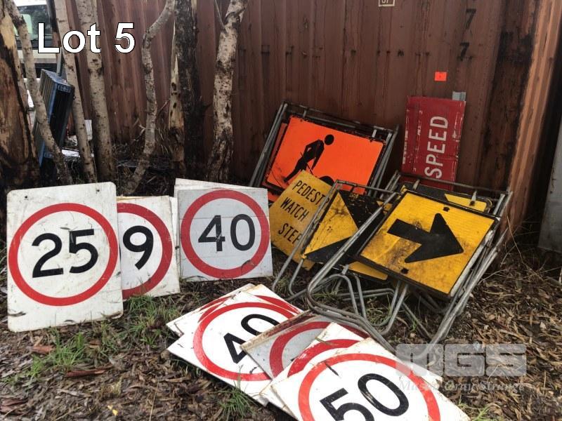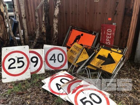 LARGE QUANTITY OF ROAD SIGNS, INLCUDING SPEED, DIRECTION, MEN AT WORK ETC. & STANDS