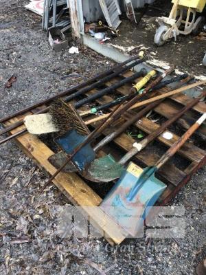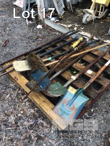 ASSORTED TOOLS, 3 x CROWBARS, 5 x LONG HANDLE SHOVES & SPADES, 1 x YARD BROOM