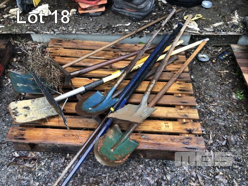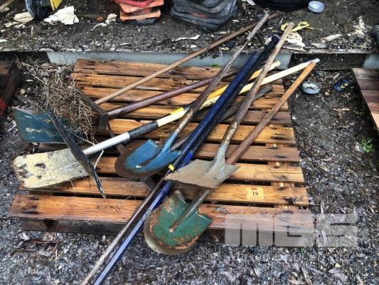 ASSORTED TOOLS, 6 x LONG HANDLED SHOVELS & SPADES, 1 x YARD BROOM, 1 x PICK , 2 x CROWBARS, 1 x SCRAPER