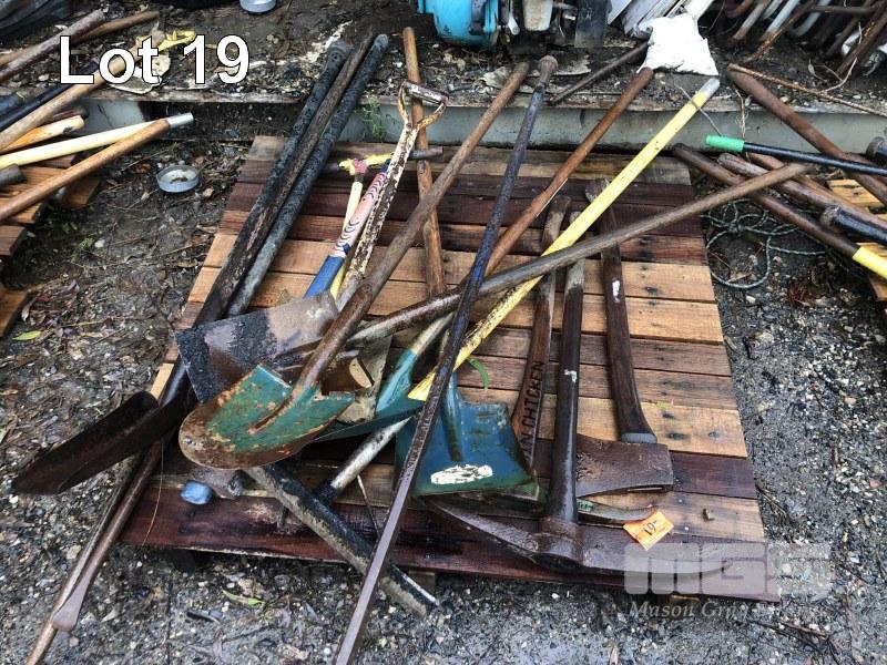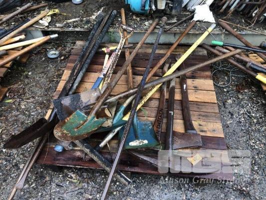 ASSORTED TOOLS, 1 x AXE, 1 x TRENCH SHOVEL, 3 x CROWBARS, 4 x LONG HANDLED SHOVELS & SPADES, 2 x PICKS, LONG SPLITTER ETC.