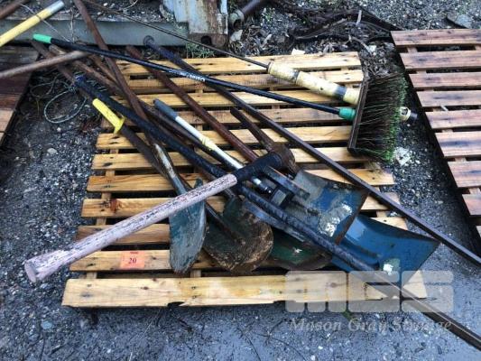 ASSORTED TOOLS, 1 x PICK, 5 x LONG HANDLED SHOVELS & SPADES, 1 x YARD BROOM , 2 x CROW BARS, 1 x MEASURE WHEEL