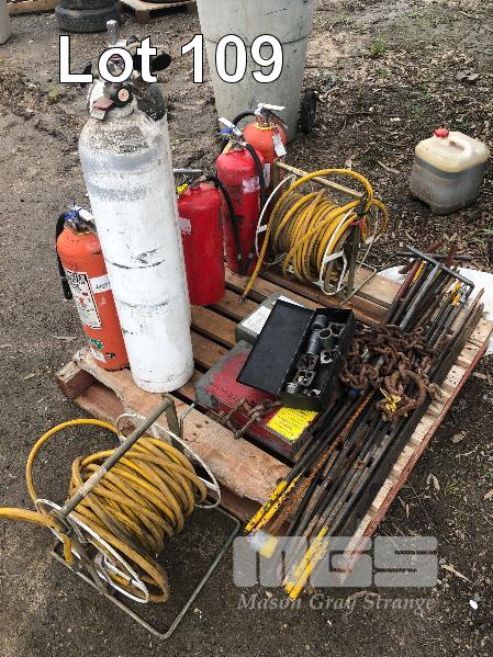 PALLET LOT, 2 x HOSE REELS, DYES IN CARRY CASE, 2 x GAS LEAK DETECTION KITS, 4 x FIRE EXTINGUISHERS, 2 x COMPRESSED AIR BOTTLES, HD CHAIN SET, STEEL BUNTING PINS, LARGE T BAR HEX KEYS