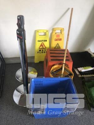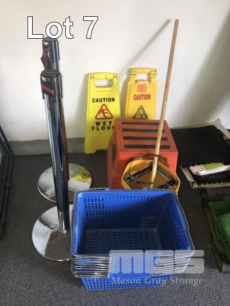 2 x WET FLOOR SIGNS, 10 x SHOP CARRY BASKETS, MOP & BUCKET, SAFETY STEP, 2 x TENSA RETRACTABLE BARRIERS