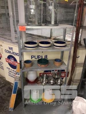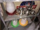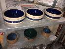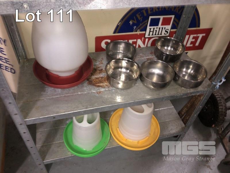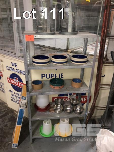 CONTENTS OF RACK, 2 x GLASS WATER FEEDERS, 6 x CERAMIC BOWLS, 5 x STAINLESS STEEL BOWLS. 3 x PLASTIC FEEDERS