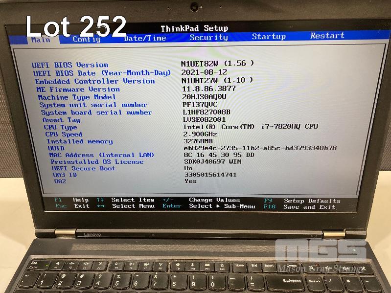 LAPTOP, LENOVO THINKPAD P51 MOBILE WORKSTATION, TYPE 20HJ, CORE i7 7820HQ (7TH GEN) @ 2.9GHz, 32GB DDR4 RAM, 512GB NVMe M.2 SSD, 15.6" WIDESCREEN (1920x1080), 4GB NVIDIA QUADRO M2200 VIDEO, Wi-Fi, BLUETOOTH, WINDOWS 10 PRO INSTALLED & POWER SUPPLY (NOTE: MARKS ON SCREEN) S/N:PF137QVC