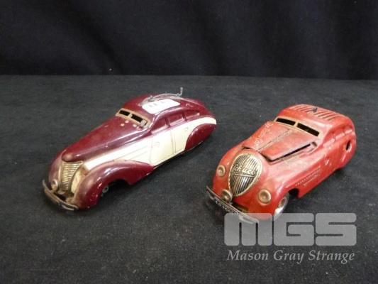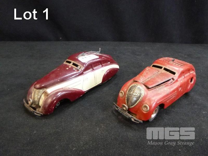 2 x SCHUCO WIND UP MODEL CARS, 1950'S. MADE IN GERMANY, 1 x KOMMANDO ANNO 200, 1 x RADIO 5000 (MISSING FRONT AXLE & WHEELS)