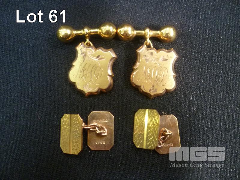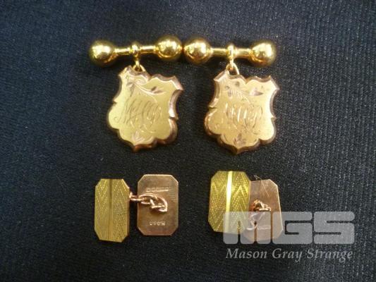 2 X PAIRS OF GOLD CUFFLINKS, INC; GOLD SHIELD CUFFLINKS, 'MHP' MONOGRAM, MARKED 9CT, 4.94 grams GOLD RECTANGULAR CUFFLINKS, MARKED 375, 4.84 grams