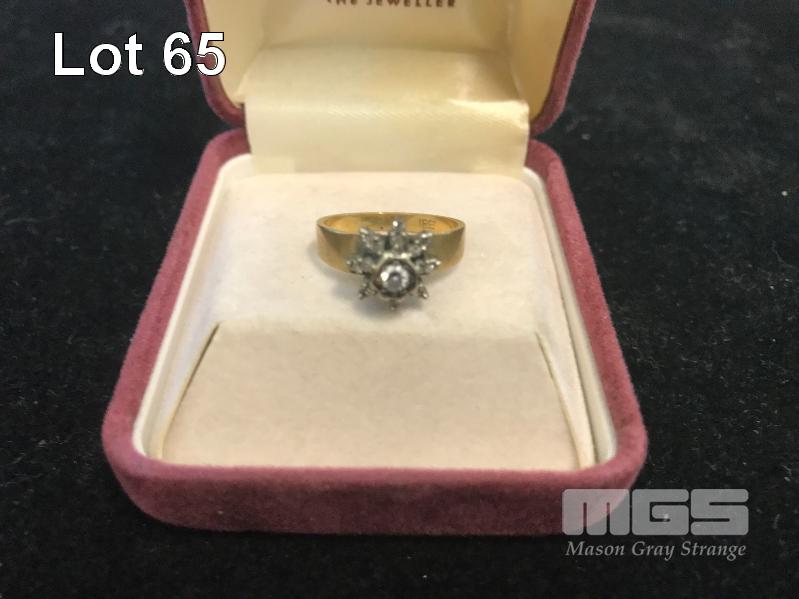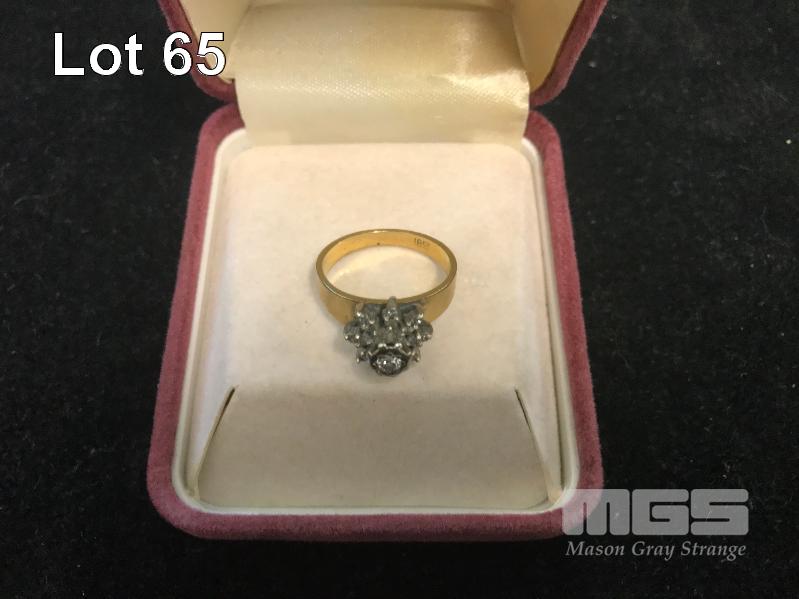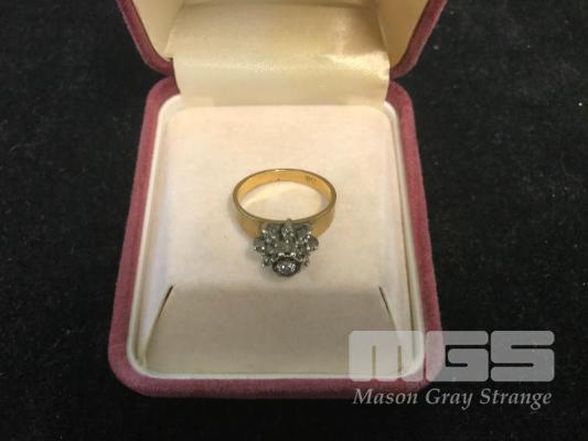 GOLD RING, CENTRAL MAIN DIAMOND & 8 SMALL SURROUNDING DIAMOND SETTING, MARKED 18 CT 4 GMS