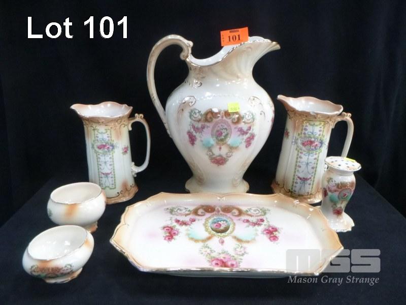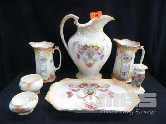 CERAMIC WARE SETTING, TRAY, 3 x HANDLED JUGS, 2 x FOOTED BOWLS & SPRINKLER