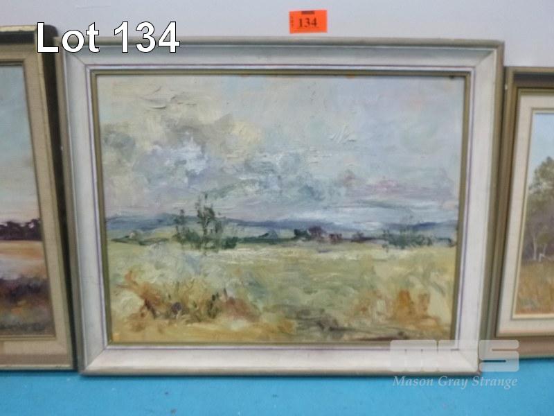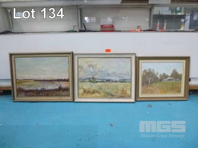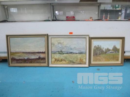 3 x FRAMED ON BOARDS INC RURAL SCENE, BY NAN ROBERTSON & NEAR PORT GAWLE No 3 BY JUNE COLLIGAN (PAINT PEEL IN SKY) & LANDSCAPE BY SHIRLEY COOMBE