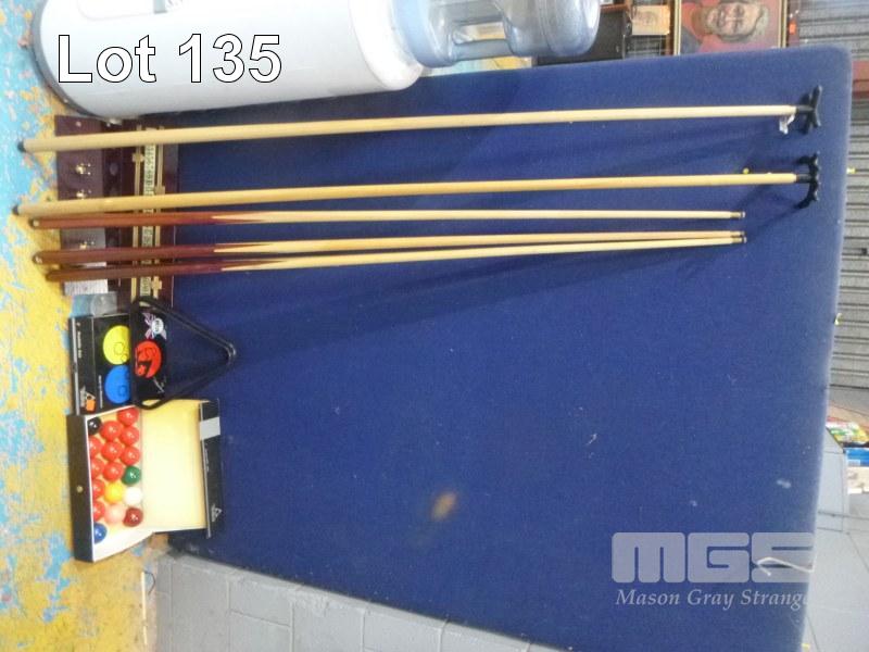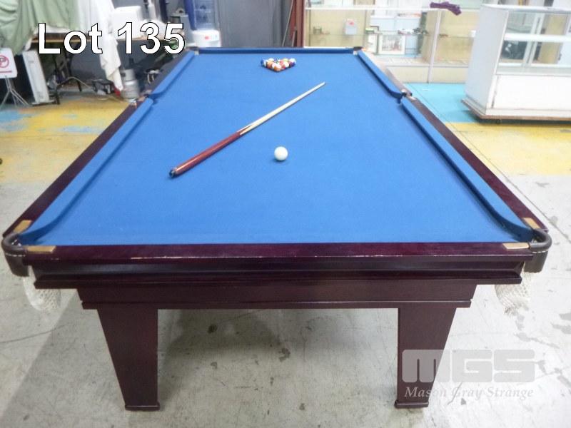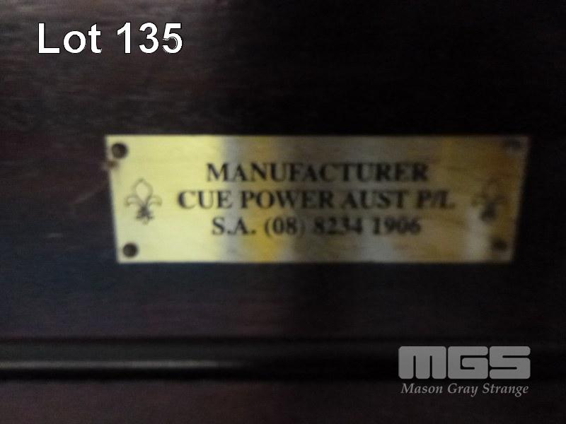 CUE POWER AUSTRALIA 8 BALL TABLE, 9' x 4'6", BLUE VELVET SURFACE KNITTED POCKETS, SLATE TOP WITH POOL CUES POOL CUE STAND, SNOOKER SCORE PANEL, SNOOKER BALLS & 8 BALLS (SOME CHIPS TO OUTER TIMBER TOP EDGE)