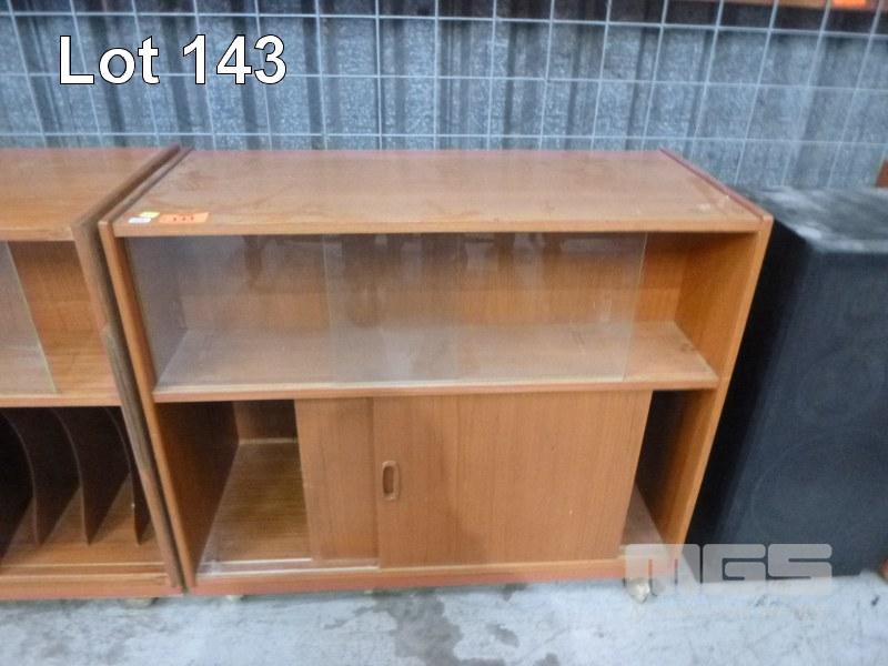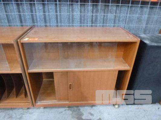 TEAK RECORD CABINET, GLAZED SLIDING DOORS ON CASTORS