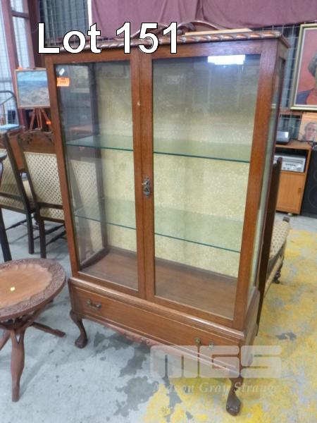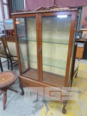 OAK CHINA CABINET, 2 x GLAZED DOORS, 2 x GLASS SHELVES, SINGLE DRAWER UNDER STORAGE, BALL & CLAW FEET