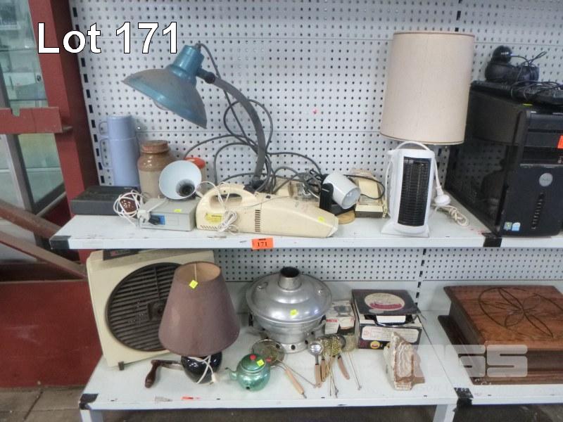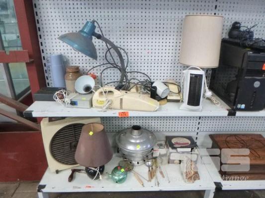 ASSORTED TABLE LAMPS, HEATER, TELEPHONES, WATSON VICTOR INDUSTRIAL TABLE LAMP, ETC, 2 x SHELVES