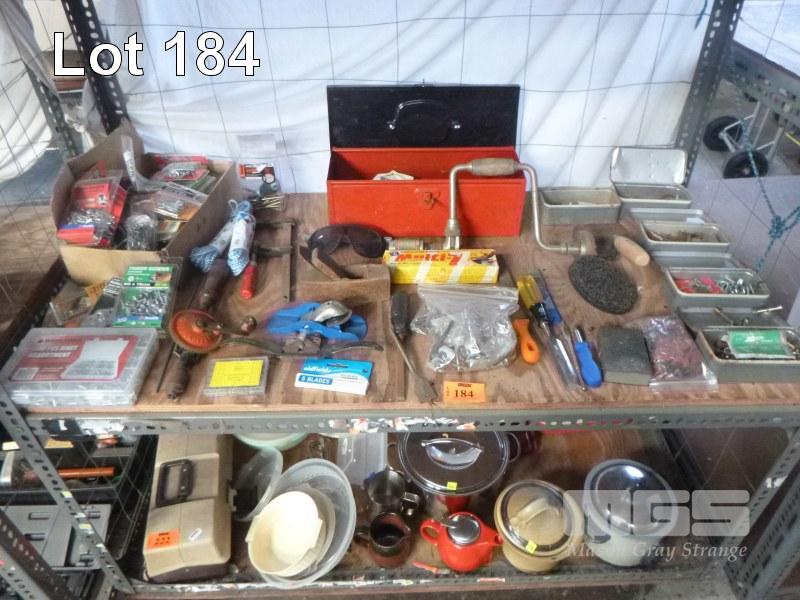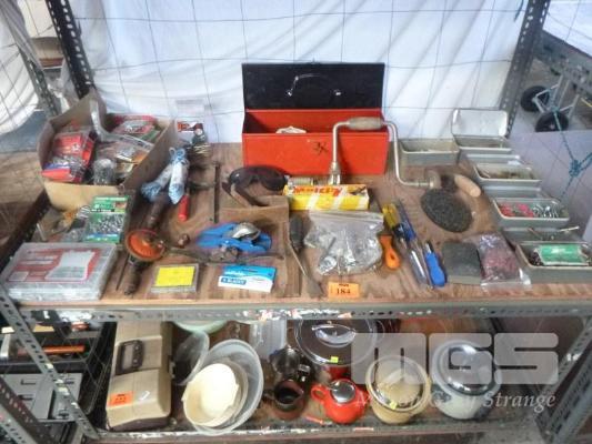 FASTENERS, STEEL TOOL BOX, FASTNER TINS & CONTENTS, SPOKE SHAVER, PALM PLANER, BRACE DRILL ETC