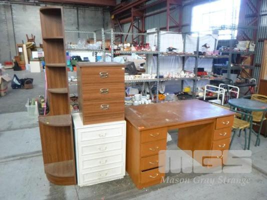 MID CENTURY DESK, 8 DRAWERS, 2 x BEDSIDE CABINETS & TIMBER LAMINATE CORNER SHELF UNIT