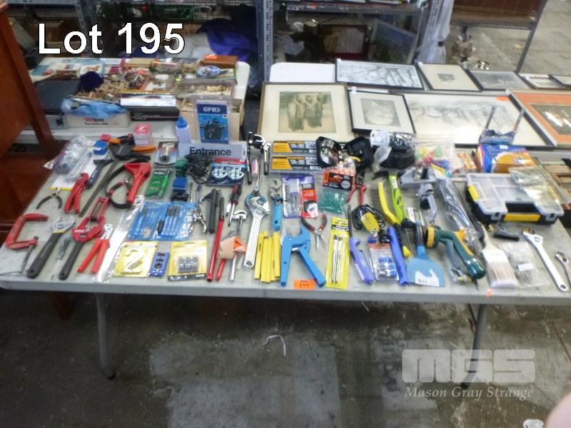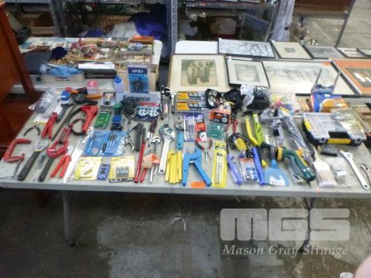 ASSORTED HANDTOOLS & HARDWARE, SHIFTERS, CLAMPS, DRILL POWERED PUMP, WATCH BACK PRESS, GRAB KITS ETC 1 X TABLE