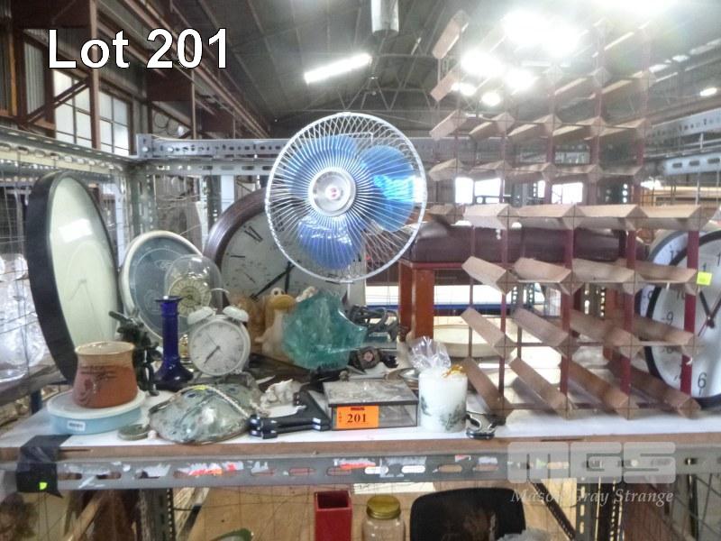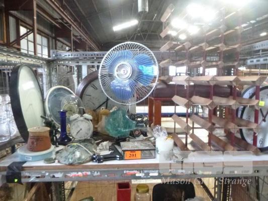 BORDEAUX WINE RACK, CLOCKS, DESK FAN, ETC