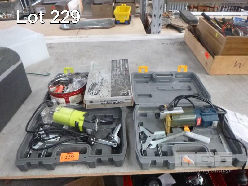 2 x TRIMMING/ROUTERS, RYOBI WITH ROUTER GUIDE & BITS