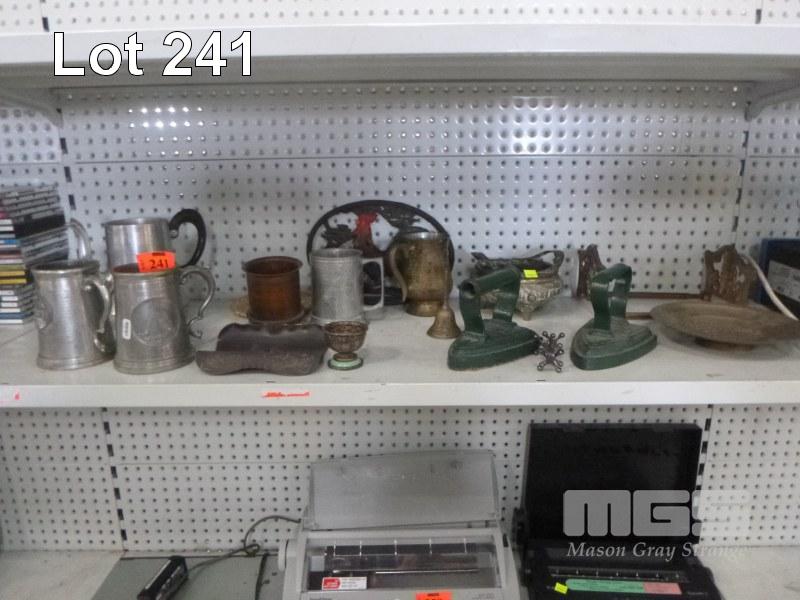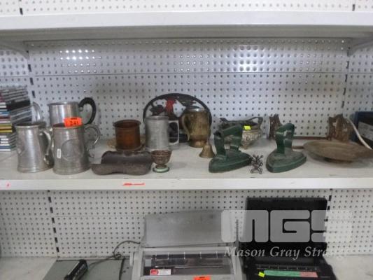 PEWTER BEER STEINS, VINTAGE IRONS, BRASSWARE, ETC