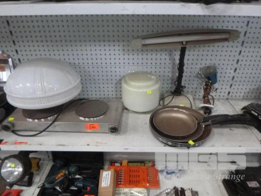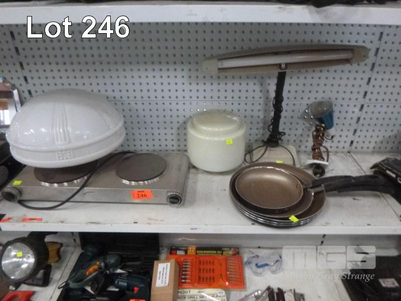 ELECTRIC 2 BURNER STOVE, TABLE LAMPS, FRY PANS & ART DECO GLASS LIGHT SHADES