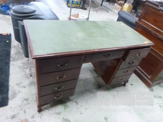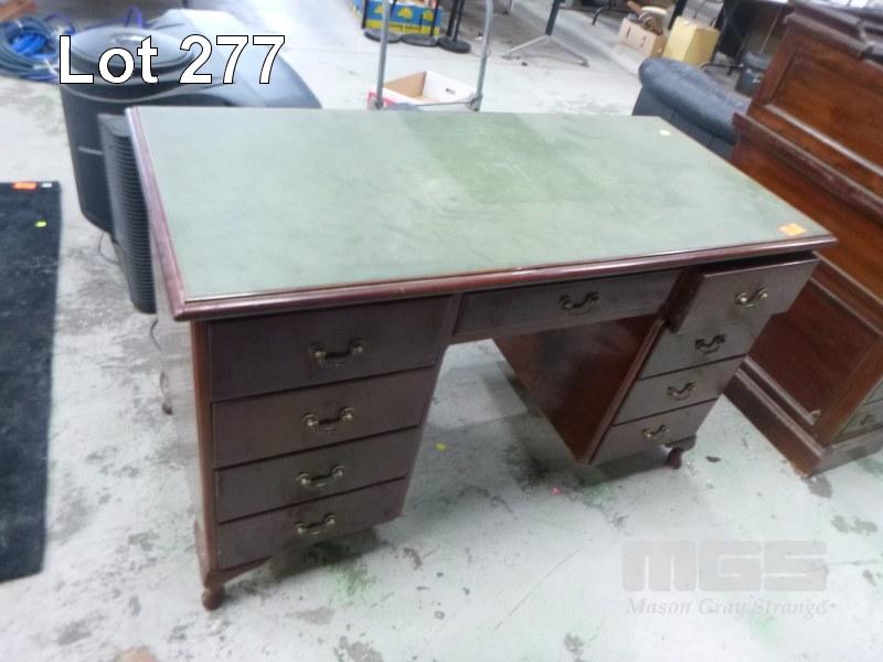 MID CENTURY POLISHED TIMBER DESK, 8 DRAWER, GREEN LEATHER TOP