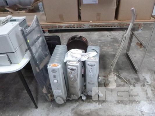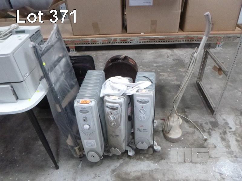 3 X COLUMN HEATERS, SHELF UNIT & FLOOR POLISHER