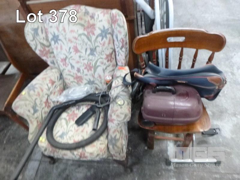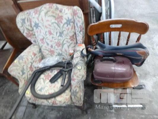 FLORAL FABRIC ARM CHAIR, TIMBER DINING CHAIR, VACUUM, WALKING STICKS, ETC