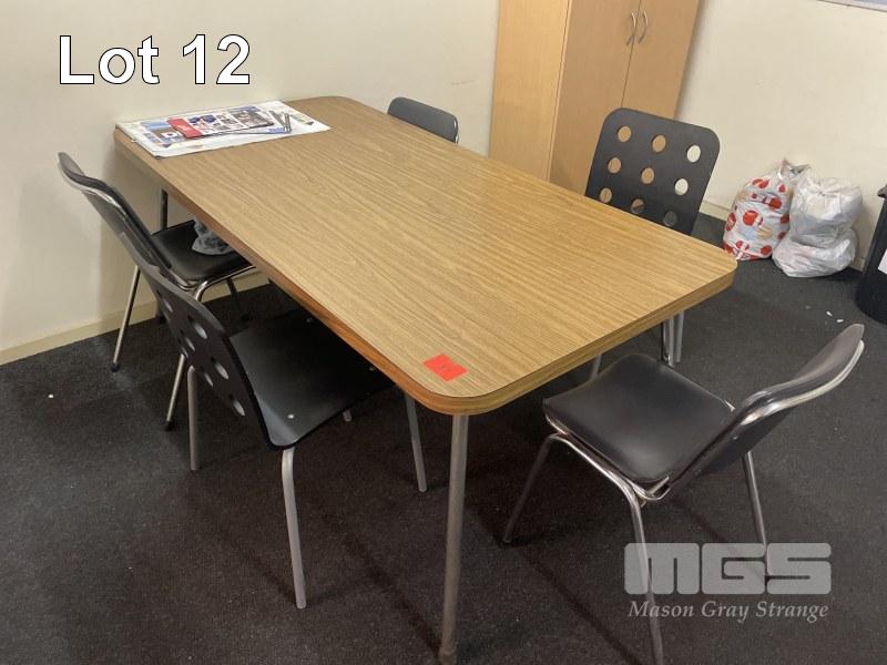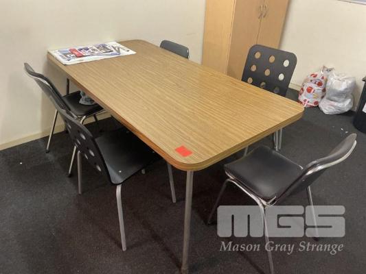 LUNCH TABLE, 210cm, TIMBER GRAIN LAMINATE & 5 x ASSORTED OFFICE CHAIRS