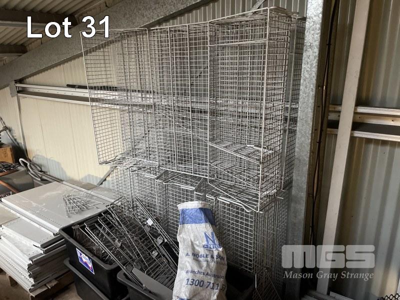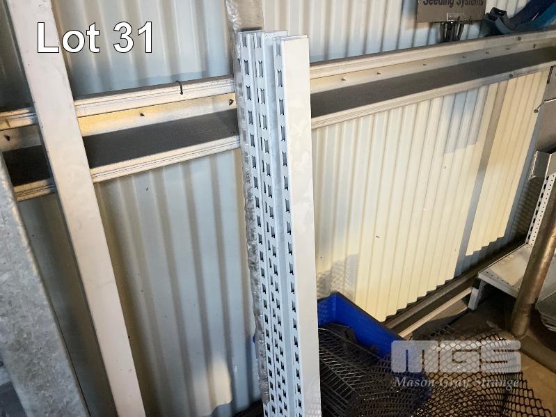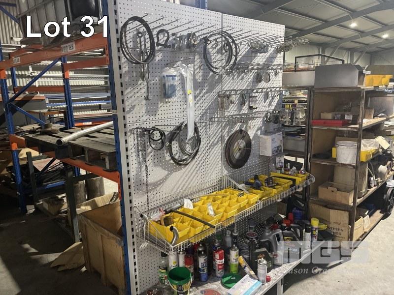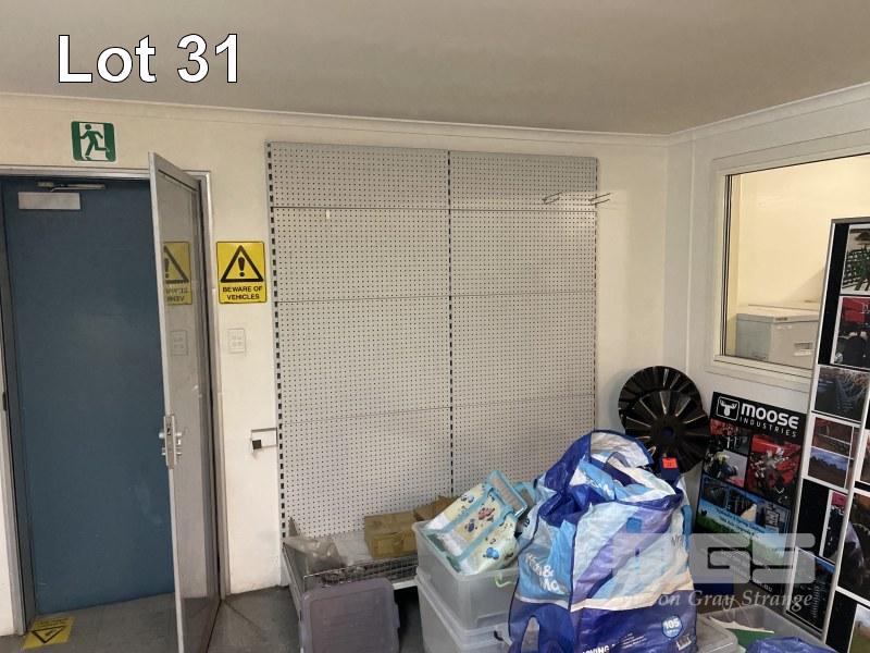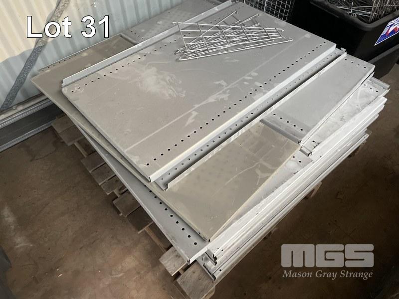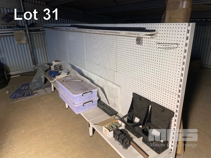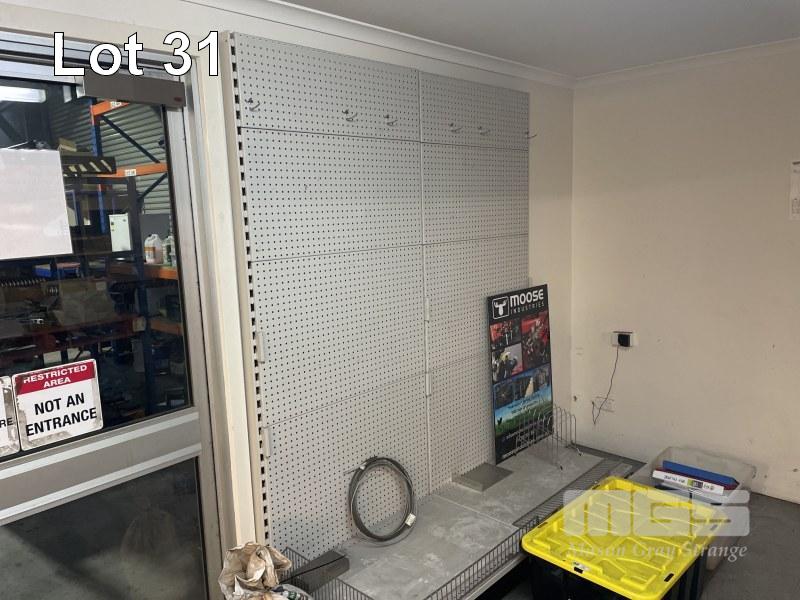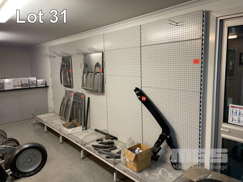 11 BAYS SHOP WALL STEEL PEGBOARD DISPLAY UNITS, EACH 90 x 200cm, GREY POWDER COATED (IN SHOWROOM)& 1 x PALLET SHELVING BRACKETS, BASKETS & LOWLINE DOUBLE & SINGLE SIDED SHELVING UNITS (ON MEZZANINE)
