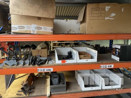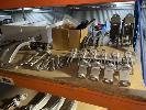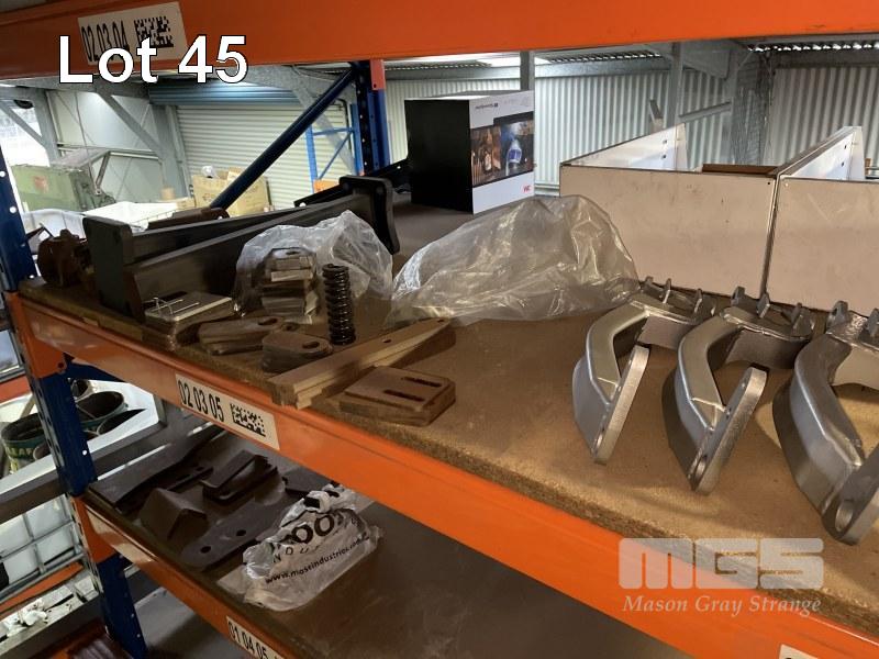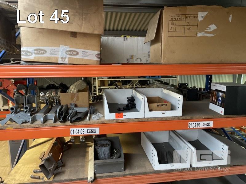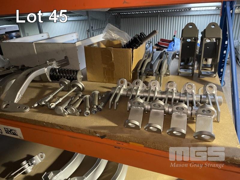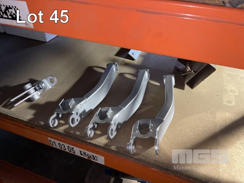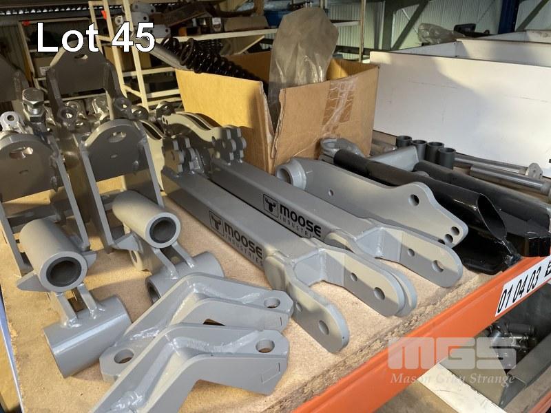 RACK OF FINISHED PRODUCT, MOOSE ARMS, PINS, BUSHES, SPRING SET, ETC, (NOT INCLUDING RACK)