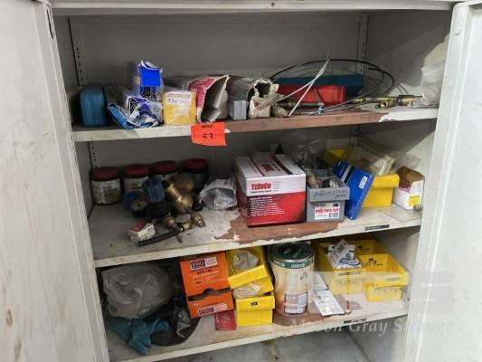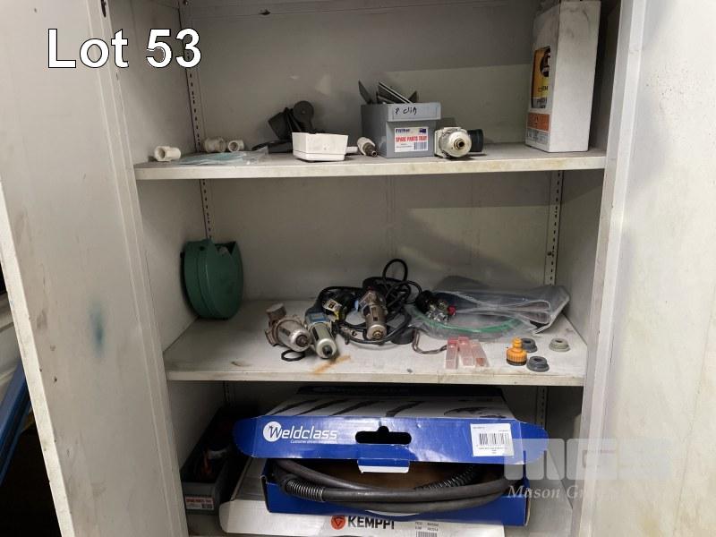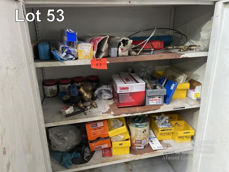 WELDING SPARES IN 2 CABINETS, MIG, OXY, TIPS, RODS, REGULATORS, USED MIG HANDPIECE, ETC (NOT INCLUDING CABINETS)