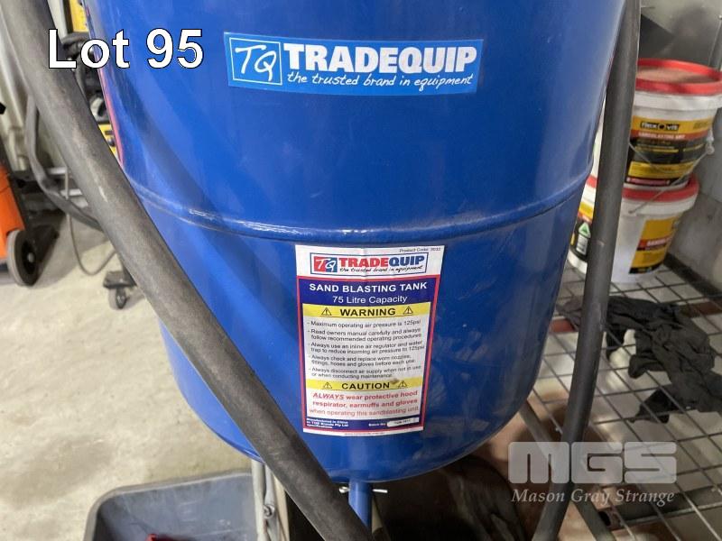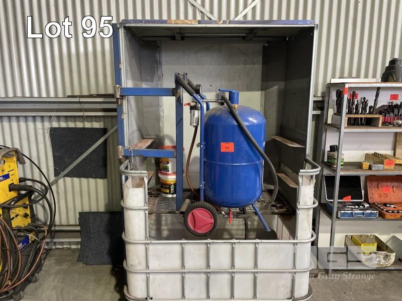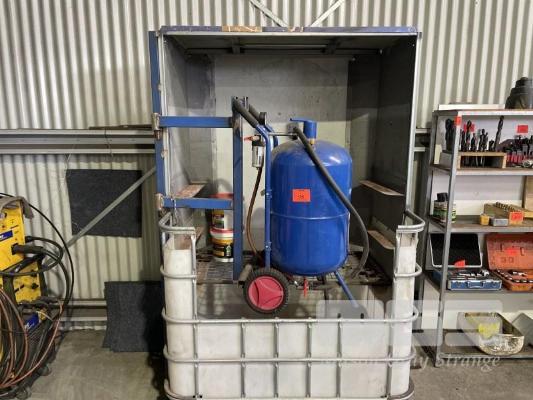 TRADEQUIP, 75 LITRE PORTABLE GRIT BLAST SET, UTILISING 1000 LITRE IBC TUBE STEEL ENCLOSURE WITH SWING OUT ARM 60 LITRE GRIT POT, HOSE & HAND PIECE