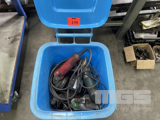 SMALL PVC BIN & ASSORTED POWER TOOLS, ALL FAULTS