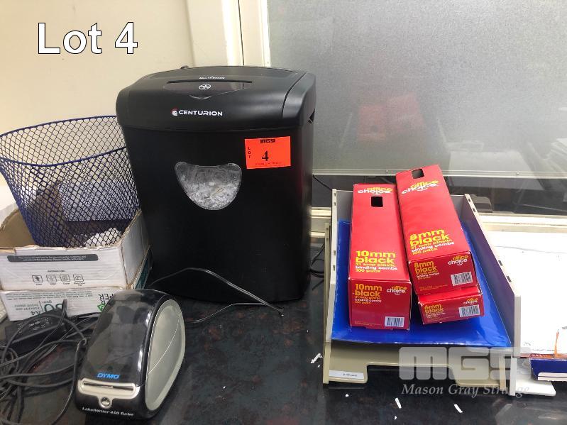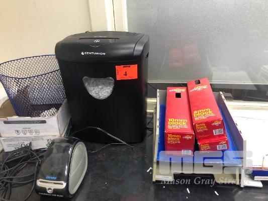 CENTURION PAPER SHREDDER & ASSORTED OFFICE HARDWARE & STATIONERY, DYMO LABEL PRINTER, PLASTIC PAMPHLET STANDS, A4 COPY SAFE SHEETS, ETC