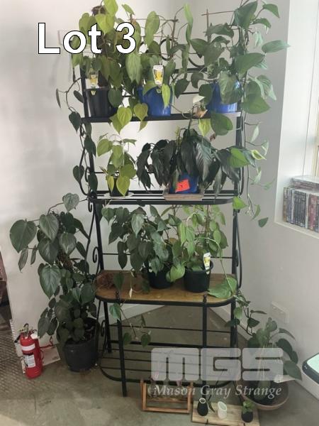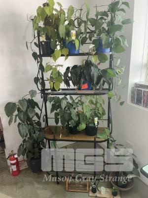 9 x POTTED PLANTS, MAINLY PHILODENDRONS & 4 TIER STAND