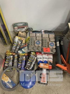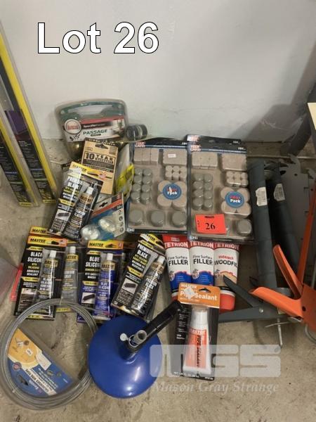 HOUSEHOLD HARDWARE, SILICONES, DRAIN SNAKE, CAULKING GUN, FELT PADS, WEATHER STRIPS, ETC