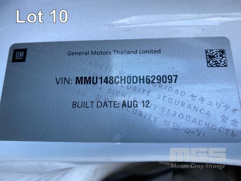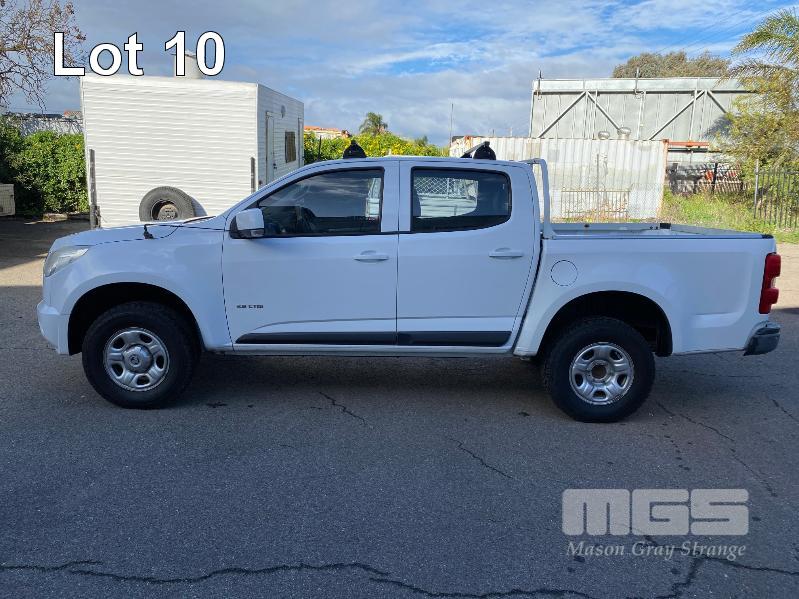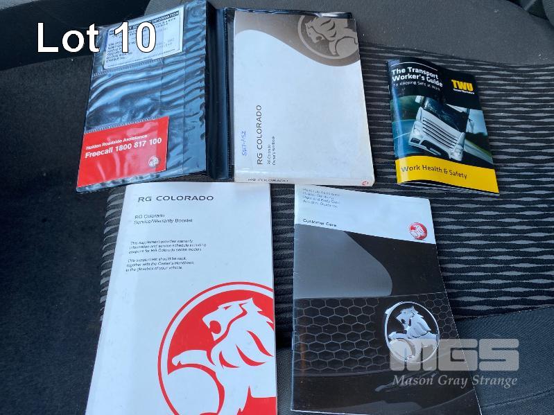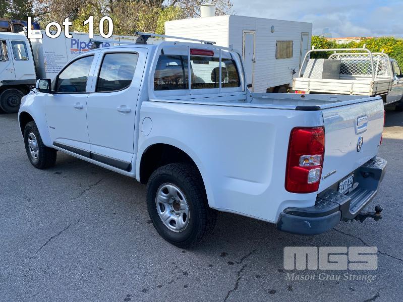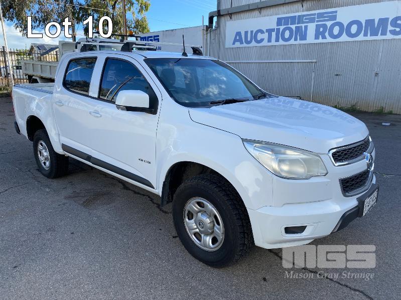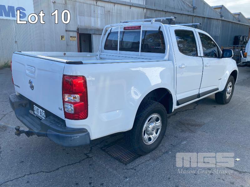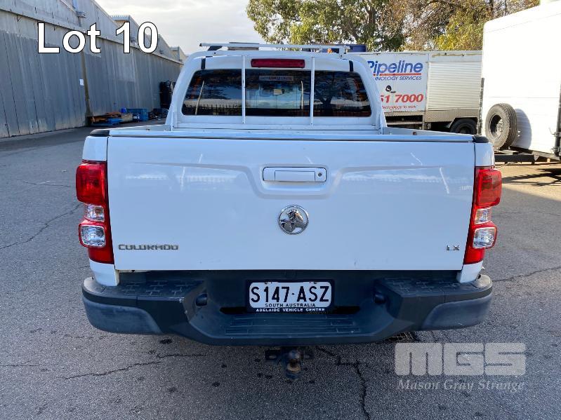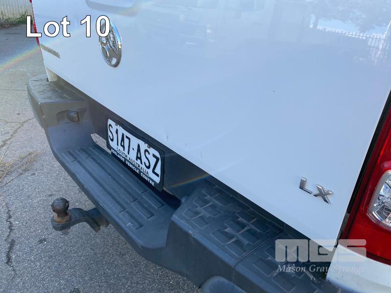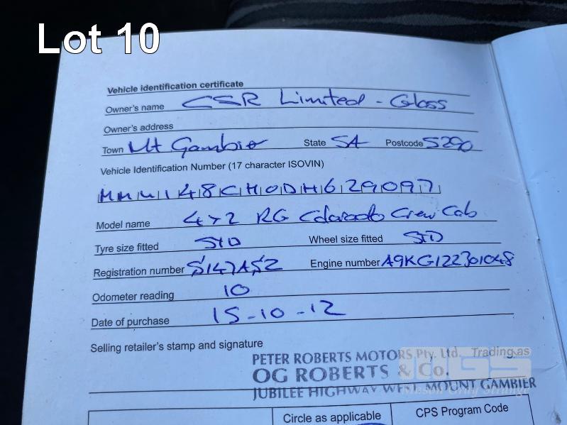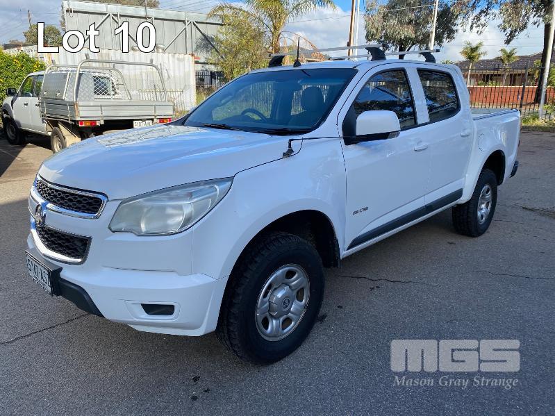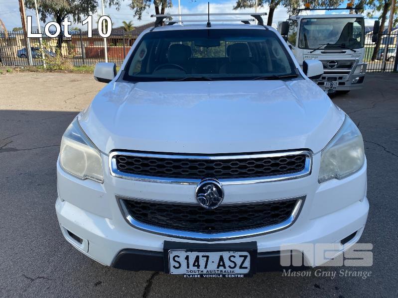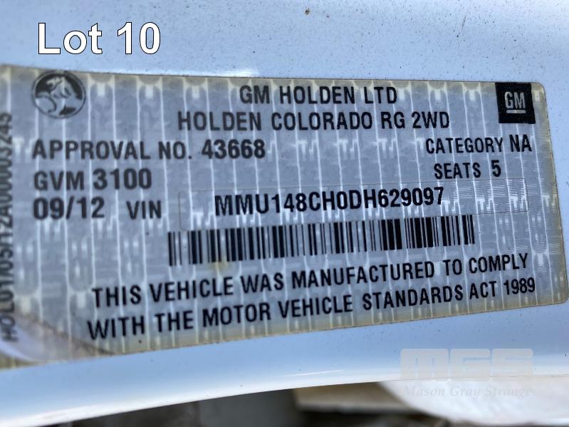 2012 HOLDEN COLORADO LX RG DUAL CAB UTILITY REG: S147 ASZ (SA) VIN: MMU148CH0DH629097 ENG: A9KG122301048 ODO: 243,802kms SHOWING 2.8 CTDI, AUTOMATIC TRANSMISSION, TURBO DIESEL, WHITE DUCO, 4 DOORS, 5 SEAT, 2WD ABS, AIR BAG, AIR CON, BLUETOOTH, CD PLAYER, CENTRAL LOCKING, CRUISE CONTROL, IMMOBILISER, POWER STEERING, ROOF RACKS, SPARE WHEEL, TOW BAR, POWER WINDOWS KEY #11 (WITH 1 KEY/S, WITH OWNER'S MANUAL, WITH SERVICE BOOKS)