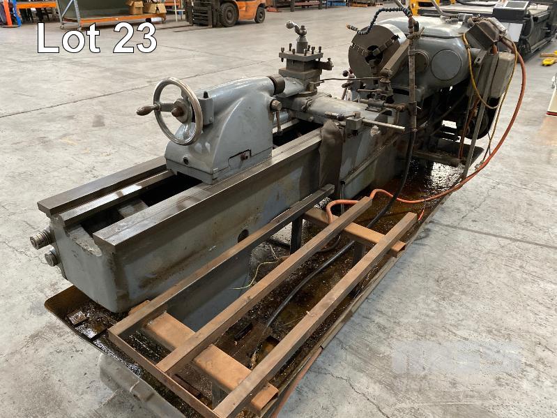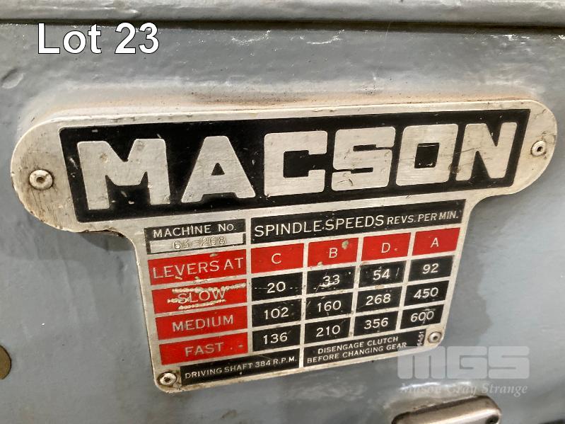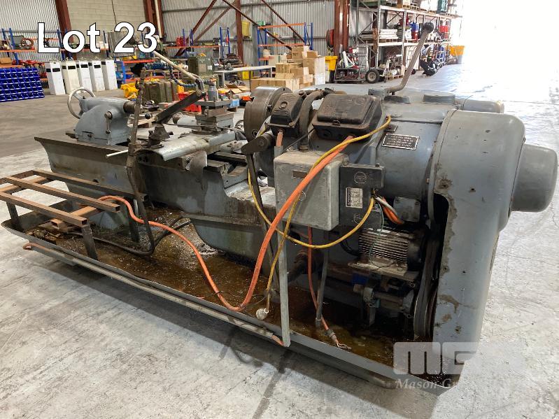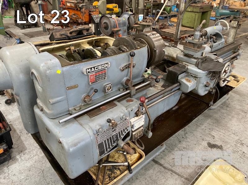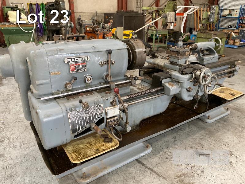 LATHE, MACSON MOD: P768 MACHINE NO: 63043 BED LENGTH: 1700mm SWING: 380mm BAR FEED: 60mm WITH 3 & 4 JAW CHUCKS, 300 & 400mm FACE PLATE, 500mm TOOL HOLDER, STEADY, TOOL POST GRINDER/BAR GRINDER, CUTTING FLUID, 240V INC 415V MOTOR TO SUIT