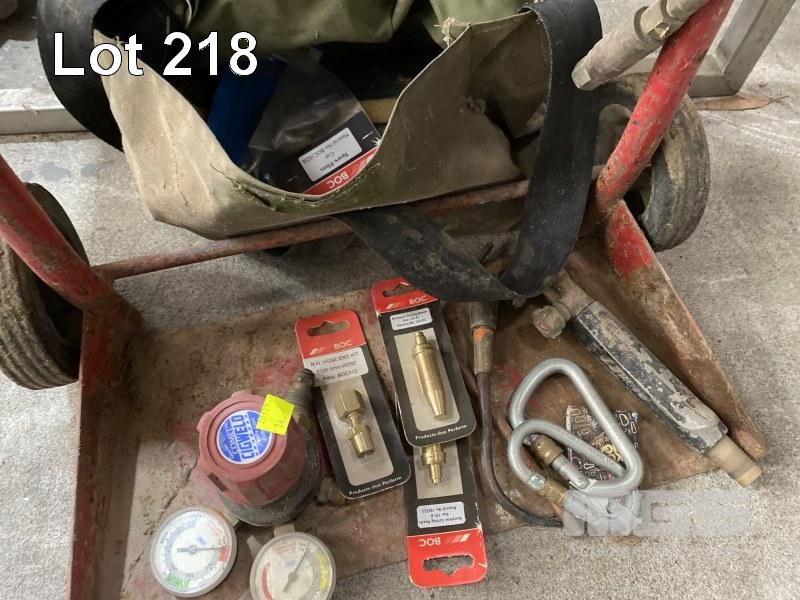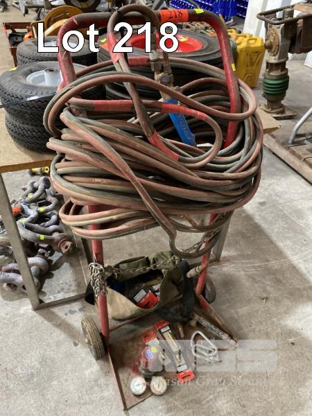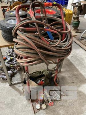 OXY ACETYLENE SET, LONG REACH HOSE, CUTTING TORCH, NEW TIPS & FITTINGS INCLUDED, (NO OXYGEN REG) WITH TROLLEY