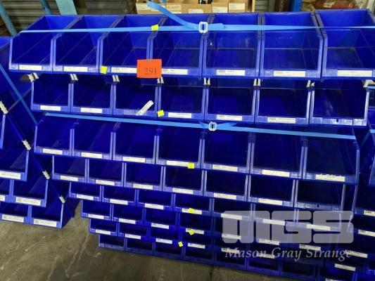 98 x PARAMOUNT, SHUTTER, STACKABLE STORAGE BINS, BLUE PLASTIC, 250 x 150mm WITH EXTENSION BARS,
