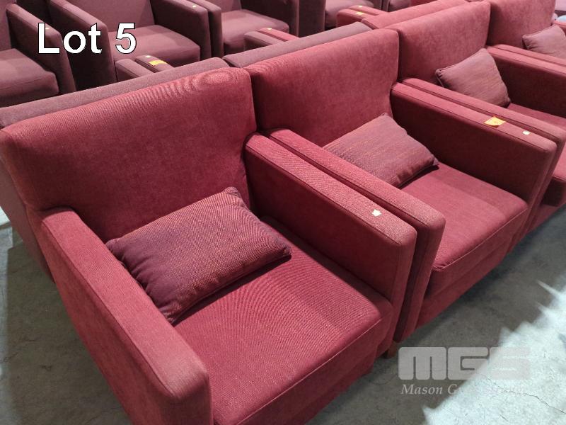 2 X UPHOLSTERED ARMCHAIRS WITH THROW CUSHIONS - TEXTURED COARSE LINEN STYLE FABRIC, TRACK ARMS IN FIRE BRICK RED.