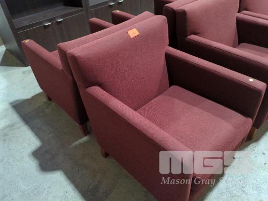 2 X UPHOLSTERED ARMCHAIRS - TEXTURED COARSE FABRIC, MIXED BRICK RED WEAVE, STITCHED TRACK ARMS.