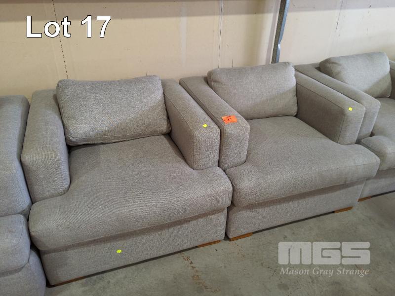 2 X UPHOLSTERED SINGLE SEAT LOUNGE CHAIRS. SQUARE ARMS, TEXTURED PLAIN WEAVE FABRIC IN GAINSBORO.