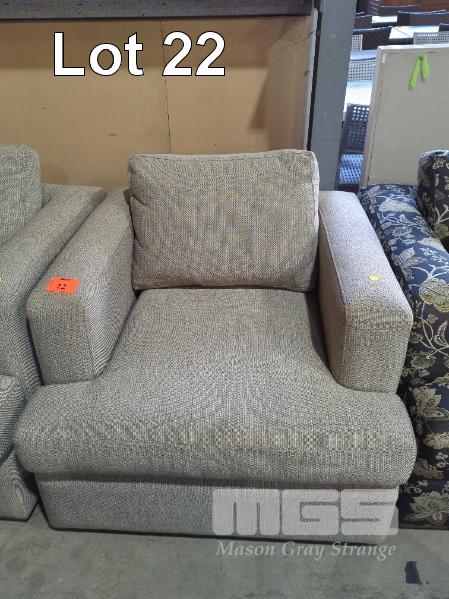 UPHOLSTERED SINGLE SEAT LOUNGE - SQUARE ARMS, MIXED GREY FABRIC, TEXTURED WEAVE WITH LIGHT STRIPE.