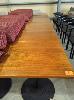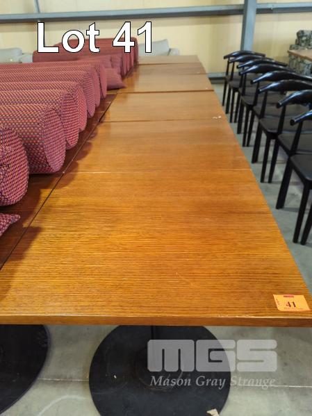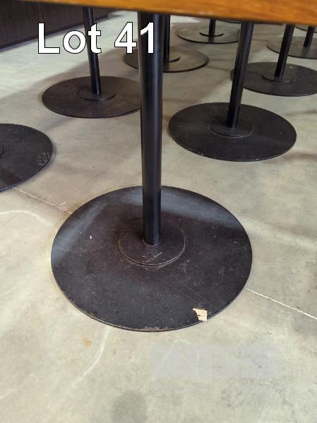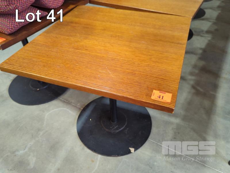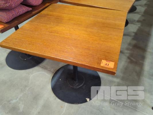 6 X FOUR-SEAT CAFE TABLES - HEAVY STEEL BASE IN BLACK, SOLID FINE GRAIN HARDWOOD TOPS WITH INTERLOCK LUGS. 80 X 80 CM.