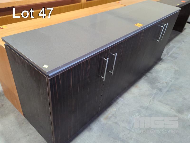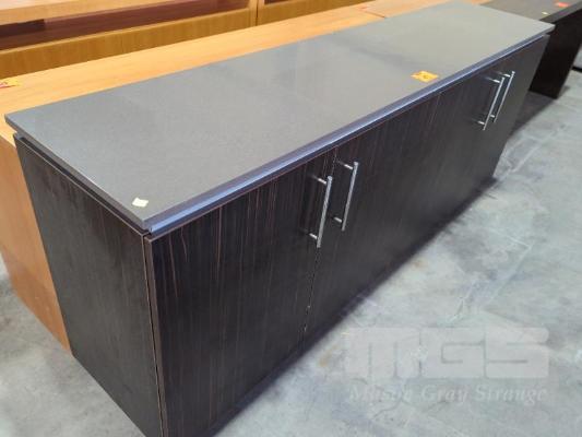 STONE TOP SIDEBOARD - FOUR DOOR, TWO SHELF WOODGRAIN TIMBER LAMINATE BODY IN "BLACK ASH". STAINLESS STEEL LOOK HANDLES . STONE TOP IN "MOCHA". 200 X 45 X 79.5 CM (W D H).